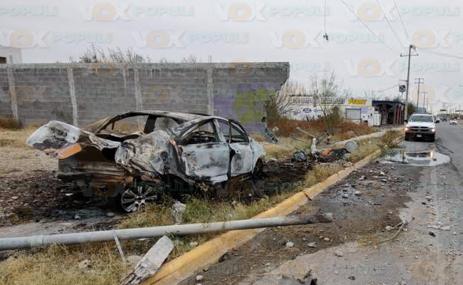 Tras el impacto inicial, la unidad motriz continuó su trayectoria hasta chocar contra una barda de concreto ubicada en el mencionado bulevar, terminado por arder en llamas.