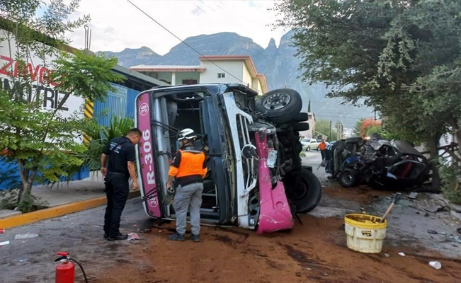 Un camión de pasajeros que se quedó sin frenos impactó a 6 unidades en su loca carrera y después terminó volcado, en el municipio de Santa Catarina,