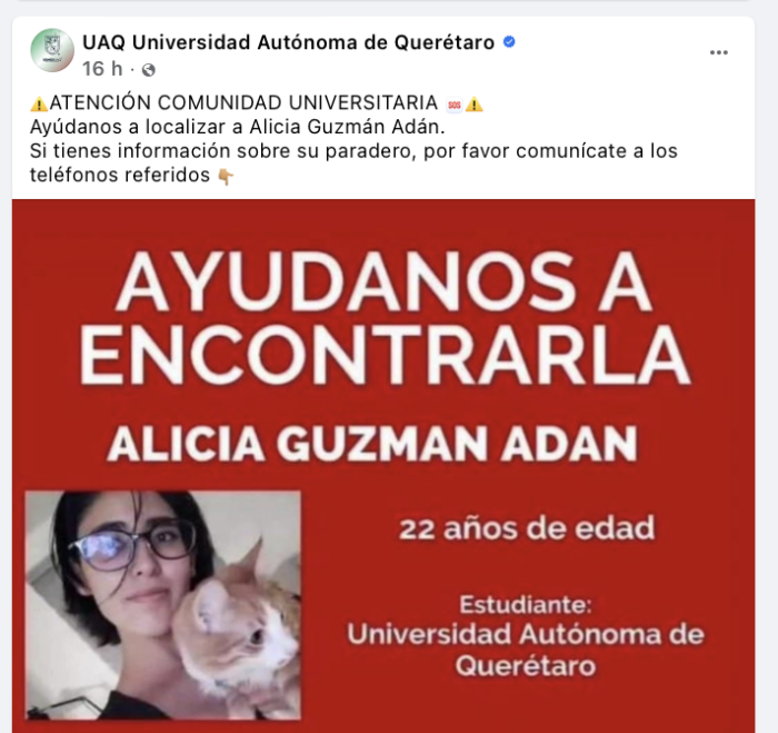 Recientemente, se dio el llamado en redes sociales de que la estudiante, identificada como Alicia Guzmán Adán fue identificada como desaparecida desde el pasado 15 de septiembre por razones desconocidas en Santiago de Querétaro.