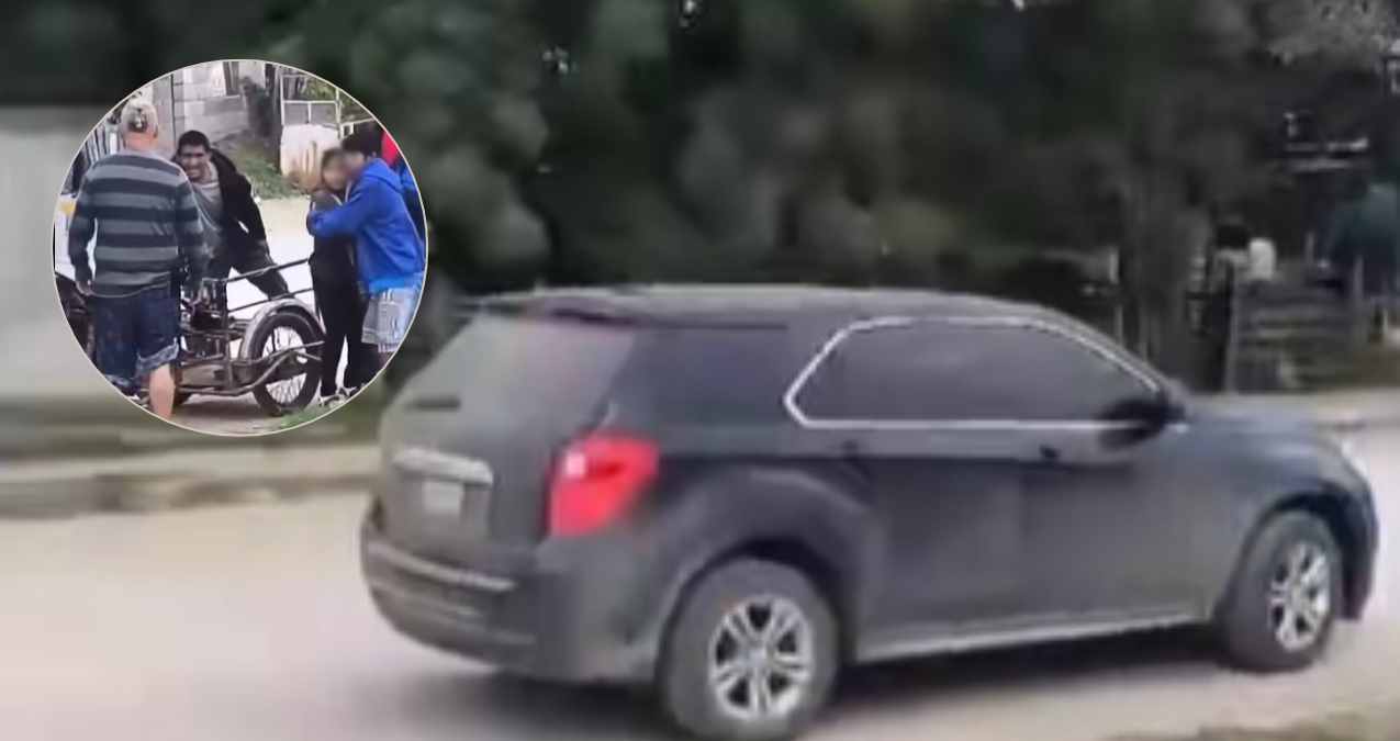 En las imágenes se observa al padre de familia adolorido junto al triciclo dañado. Esto mientras los demás miembros de la familia, visiblemente asustados, también muestran signos de dolor.