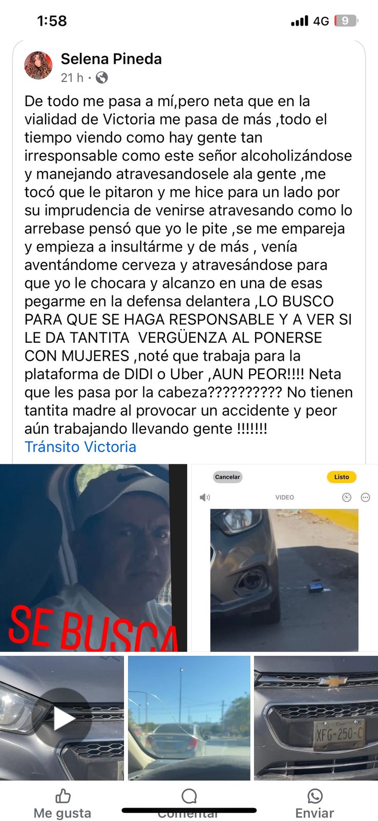 “Lo busco para que se haga responsable y a ver si le da tantita vergüenza al ponerse con mujeres. Noté que trabaja para la plataforma de Didi o Uber, ¡aún peor! No tienen tantita madre al provocar un accidente y peor aún trabajando, llevando gente”.