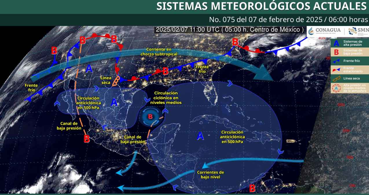 Pronóstico del clima para el viernes 7 de febrero: lluvias, calor y viento fuerte en varias regiones de México. Este 7 de febrero, el clima en México será variado. Un canal de baja presión sobre el sureste del país, junto con la humedad proveniente del Golfo de México y el Mar Caribe, generará lluvias e intervalos de chubascos en Veracruz, Oaxaca y Chiapas, así como en la península de Yucatán. Además, se espera el ingreso de humedad desde el Pacífico, que podría traer lluvias aisladas en el occidente y centro del país.