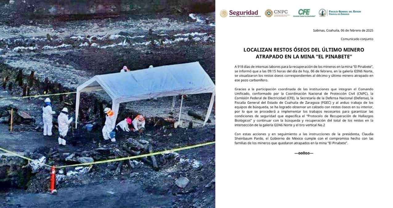 “A 918 días de intensas labores para la recuperación de los mineros en la mina ‘El Pinabete’. Se informó que a las 09:15 horas del día de hoy, 06 de febrero, en la galería GSN6 Norte, se visualizaron los restos óseos correspondientes al décimo y último minero atrapado en ese pozo carbonífero”, señaló la CNPC.
