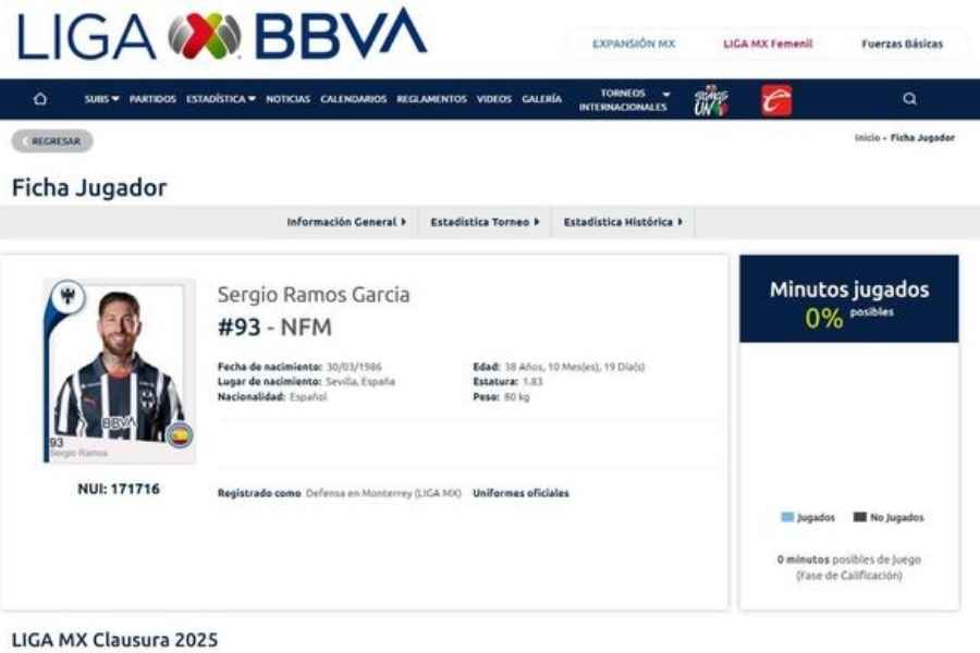 Sergio Ramos registrado en la Liga MX: inactivo desde mayo del 2024