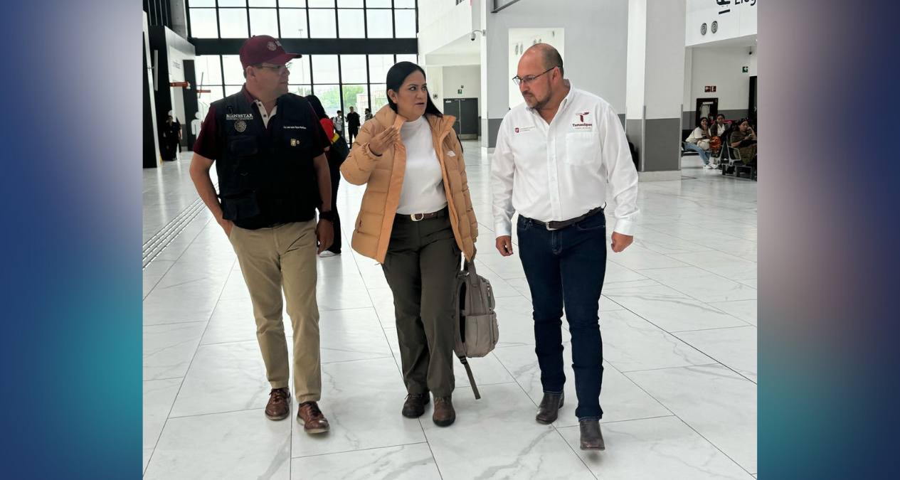 La secretaria de Bienestar federal, Ariadna Montiel Reyes, arribó esta mañana a Reynosa y fue recibida por el secretario general de Gobierno, Héctor Joel Villegas González.
