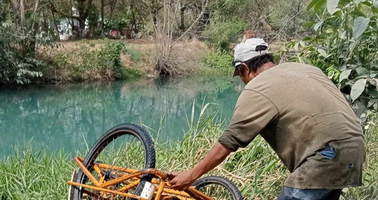 Un hombre que viajaba en su triciclo por un camino de terracería en El Mante se llevó el susto de su vida tras caer al canal de riego junto con su pesada carga.
