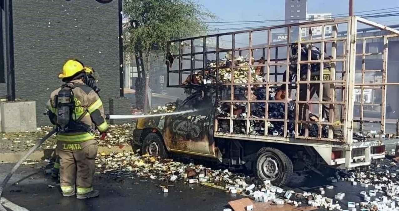 Una camioneta que transportaba medicamentos controlados se incendió en el estacionamiento de un negocio de hamburguesas en el sector San Jerónimo de Monterrey, Nuevo León