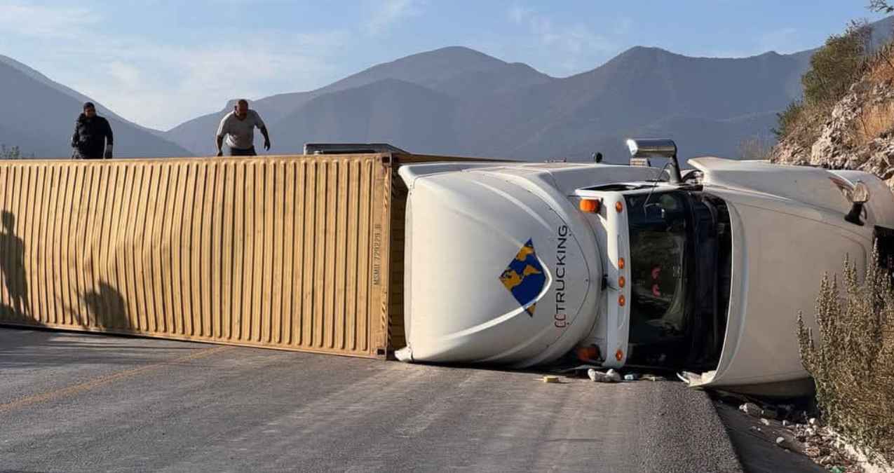 Esta mañana, un tráiler volcó sobre la carretera Tula-Jaumave, quedando atravesado a la altura del Ejido El Salto; ―Afortunadamente―, el chofer logró salir a salvo del vehículo, aunque recibió atención prehospitalaria por parte de Protección Civil de Jaumave.