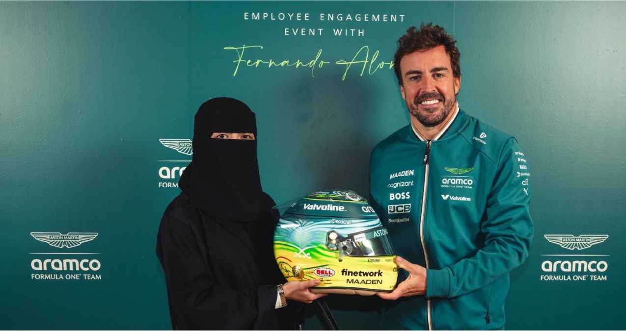 Fernando unveils a special helmet for the #SaudArabianGP with @aramco, designed by a female Saudi artist.