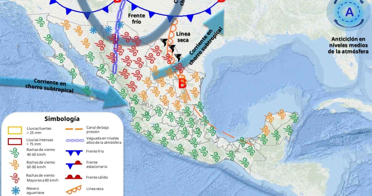 Además, —se prevé caída de nieve o aguanieve— en partes de Chihuahua y Durango. Así como temperaturas congelantes durante la madrugada en zonas montañosas de Baja California, Chihuahua y Durango, donde podrían descender hasta los -10 grados. También se registrarán temperaturas de -5 grados en zonas serranas del Estado de México y Sonora.