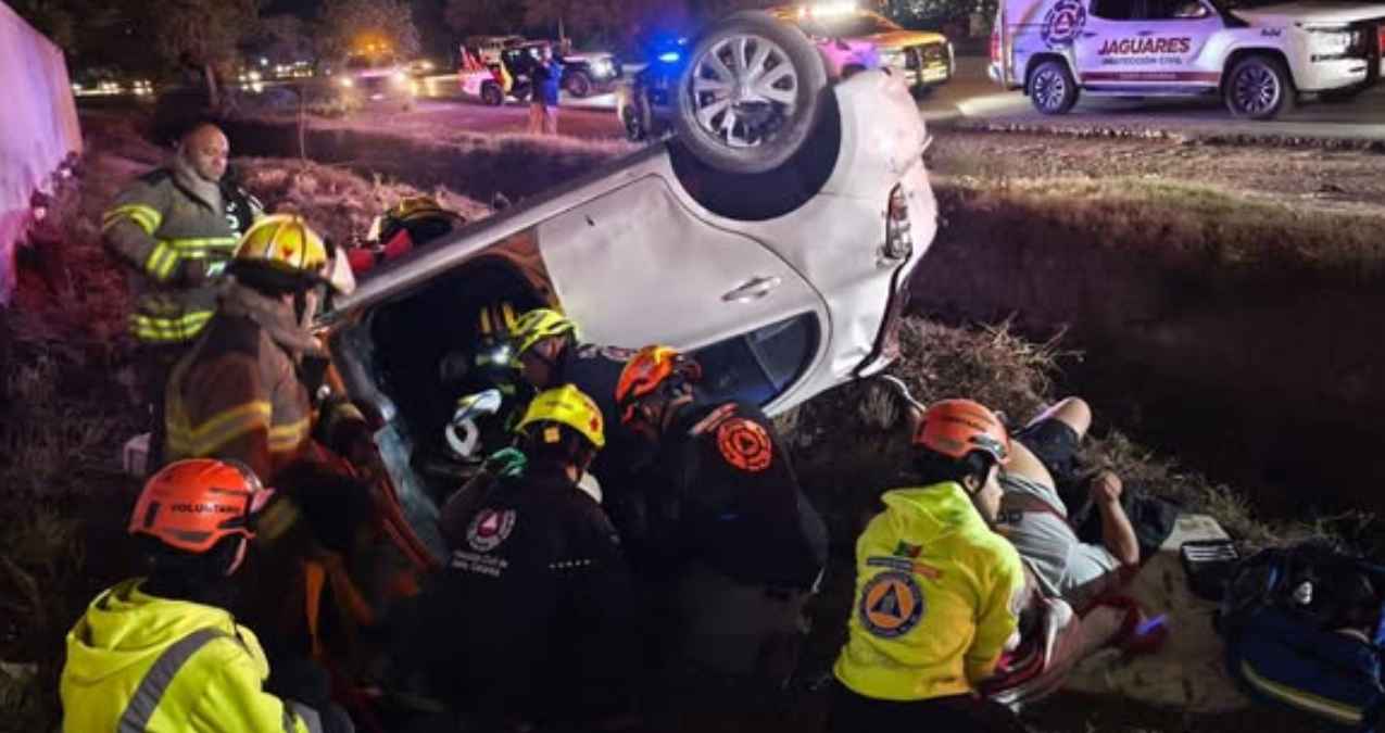 Un auto volcó sobre la Carretera a Saltillo, a la altura de la colonia Rincón de las Huertas, en Santa Catarina. El vehículo terminó con las llantas hacia arriba y dejó a dos personas lesionadas.