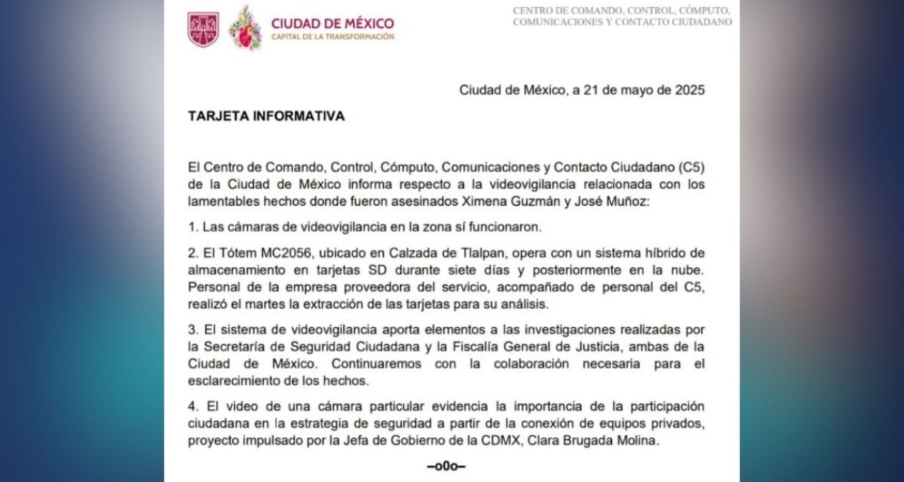 Un día después del asesinato, el C5 dio su versión. Informaron que las cámaras sí funcionaban, y explicaron que la de Calzada de Tlalpan graba en una tarjeta SD durante una semana y luego guarda la información en la nube. Técnicos del proveedor y personal del C5 ya revisaron ese material.