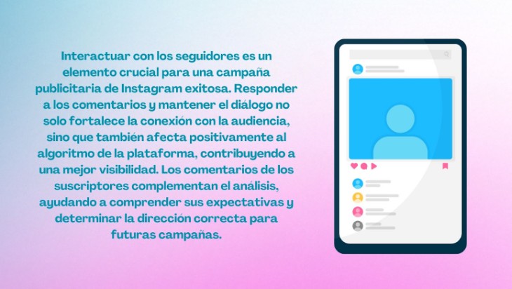 Por último, las interacciones con los seguidores son otra de las claves para el éxito de cualquier campaña publicitaria en Instagram. Es crítico tomarse el tiempo para leer sus comentarios y responderles con cierta frecuencia, porque solo de esa manera el algoritmo recibe la señal de que tu cuenta efectivamente se involucra con las dinámicas sociales de la plataforma. Instagram es una de las principales redes sociales en España, así que ese diálogo siempre debe estar presente.