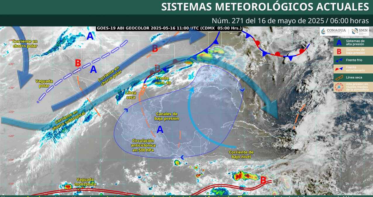 Aunque el frente frío se moverá por la noche hacia el norte de Texas, en México se mantendrán lluvias con tormentas eléctricas y posibles granizadas en estados del occidente, centro, sur y sureste del país. En Chiapas se esperan lluvias puntuales fuertes, mientras que en entidades como Michoacán, Guerrero, Morelos, Puebla, Oaxaca y Estado de México, los chubascos serán frecuentes.