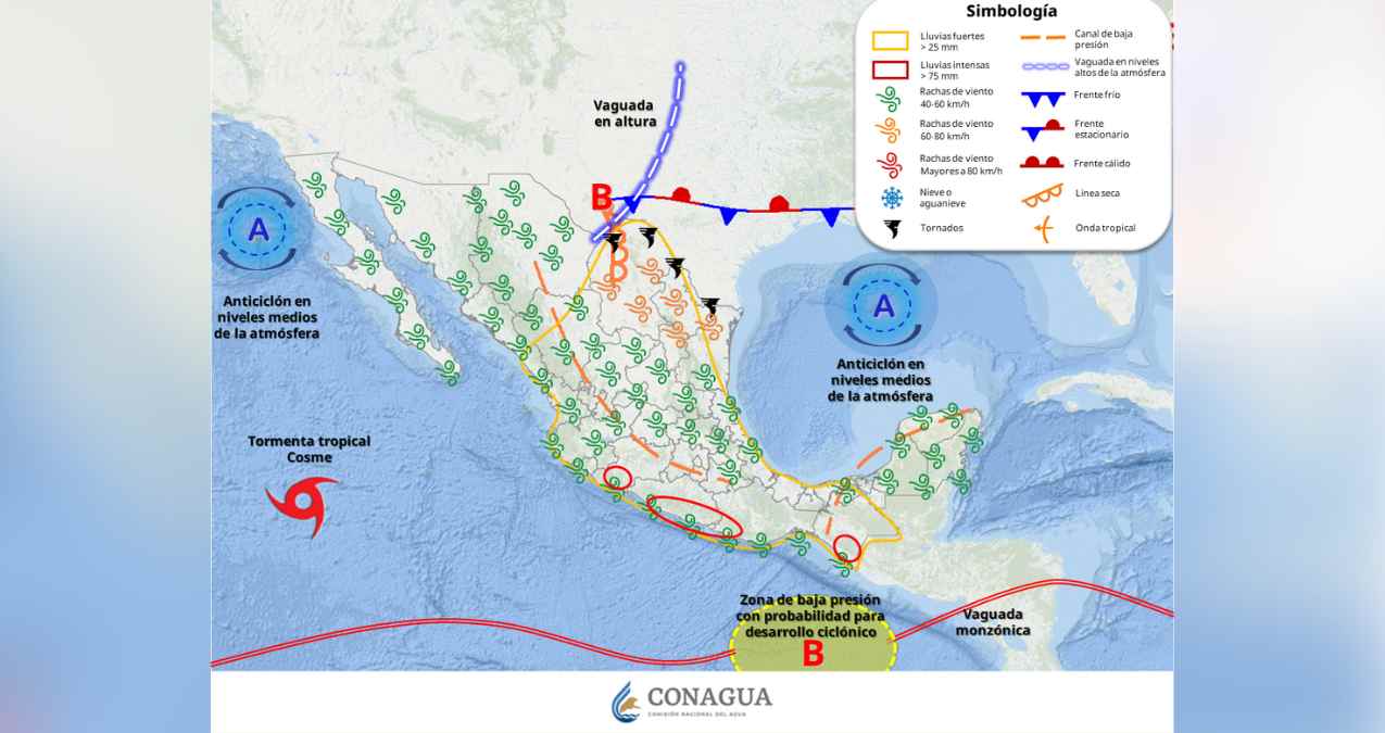 En cuanto a los ciclones, se informa que las tormentas Bárbara y Cosme ya no provocarán efectos en el país, y aunque el ciclón Dalila aún no se ha formado, se espera que pueda hacerlo a finales de la semana.
