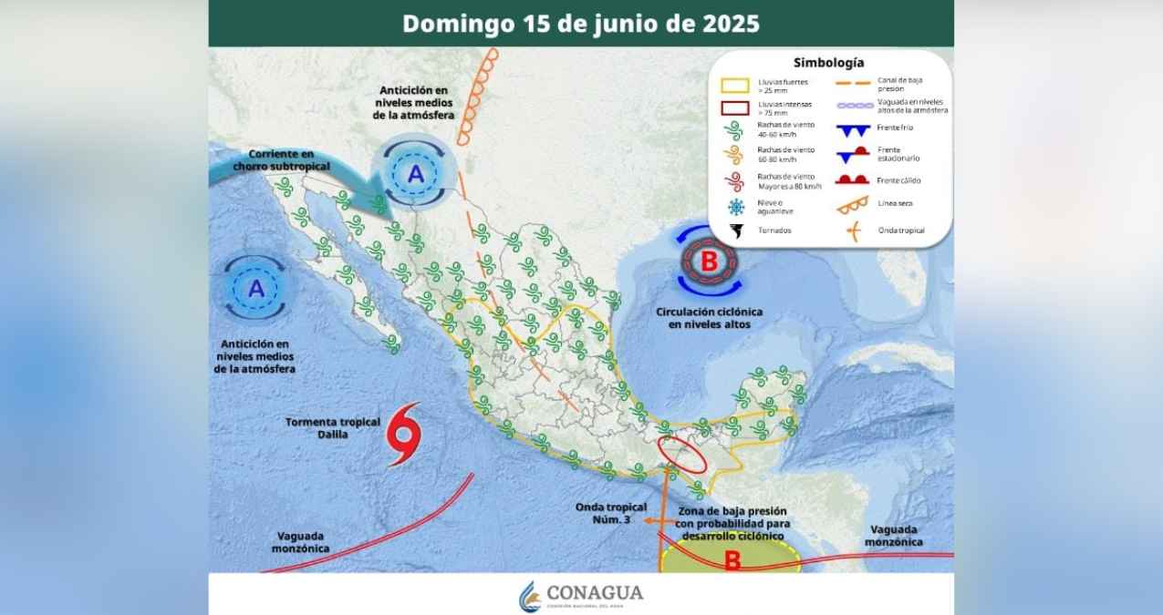 Este domingo 15 de junio, gran parte del país seguirá sintiendo los efectos del mal tiempo. Aunque la tormenta tropical Dalila comienza a alejarse de las costas mexicanas, sus bandas nubosas, junto con la onda tropical número 3 y el potencial ciclón Érick, provocarán lluvias de fuertes a intensas en al menos 26 estados.