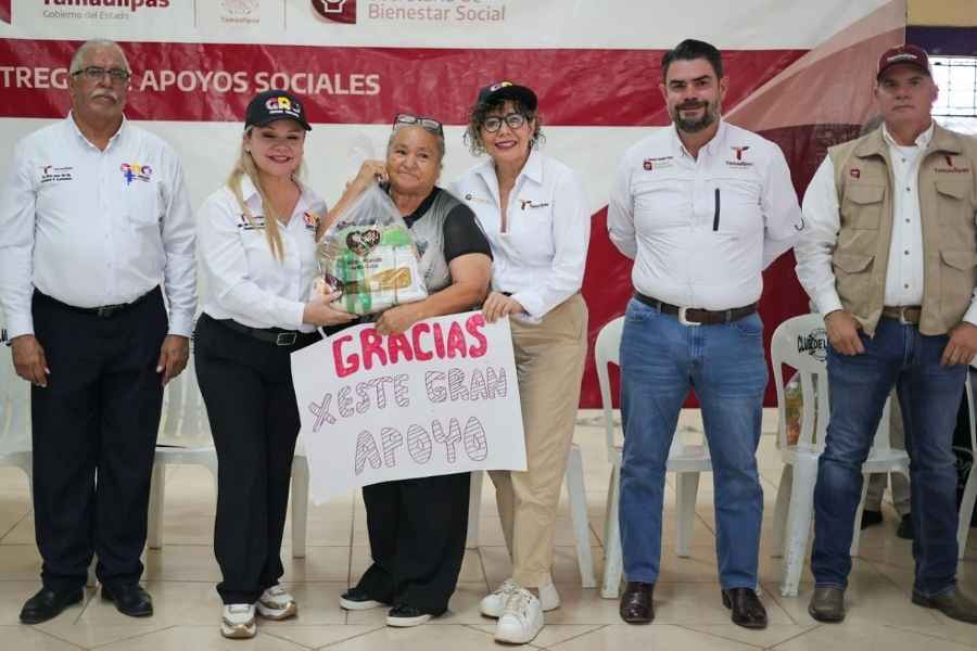 Con base en el principio solidario y humanista del gobernador Américo Villarreal Anaya, se hizo entrega de tinacos, paquetes alimentarios y de empleo temporal a familias que más lo necesitan del municipio de Nuevo Guerrero, en una gira de trabajo realizada por la secretaría de Bienestar Social, Silvia Casas González.