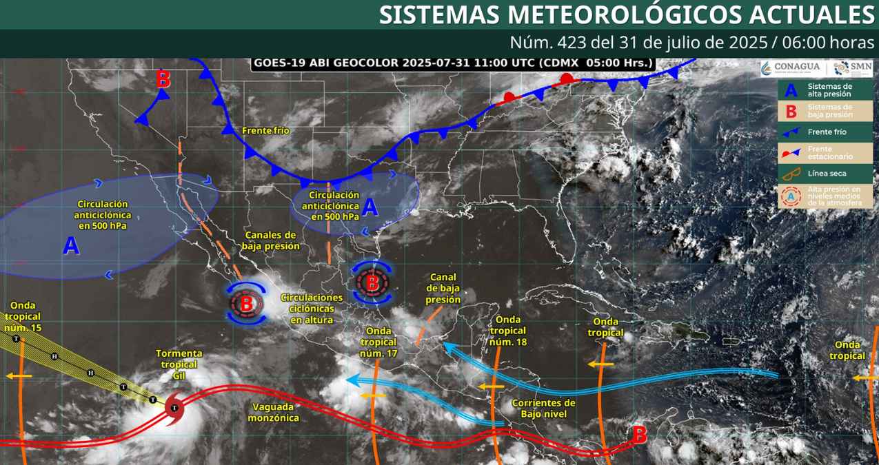 Otra circulación ciclónica y el ingreso de humedad del Pacífico y del golfo de México favorecerán lluvias en el noreste y occidente. Mientras tanto, la onda de calor continúa en estados del norte y litoral del país, con temperaturas que superan los 45 °C en Baja California y Sonora.