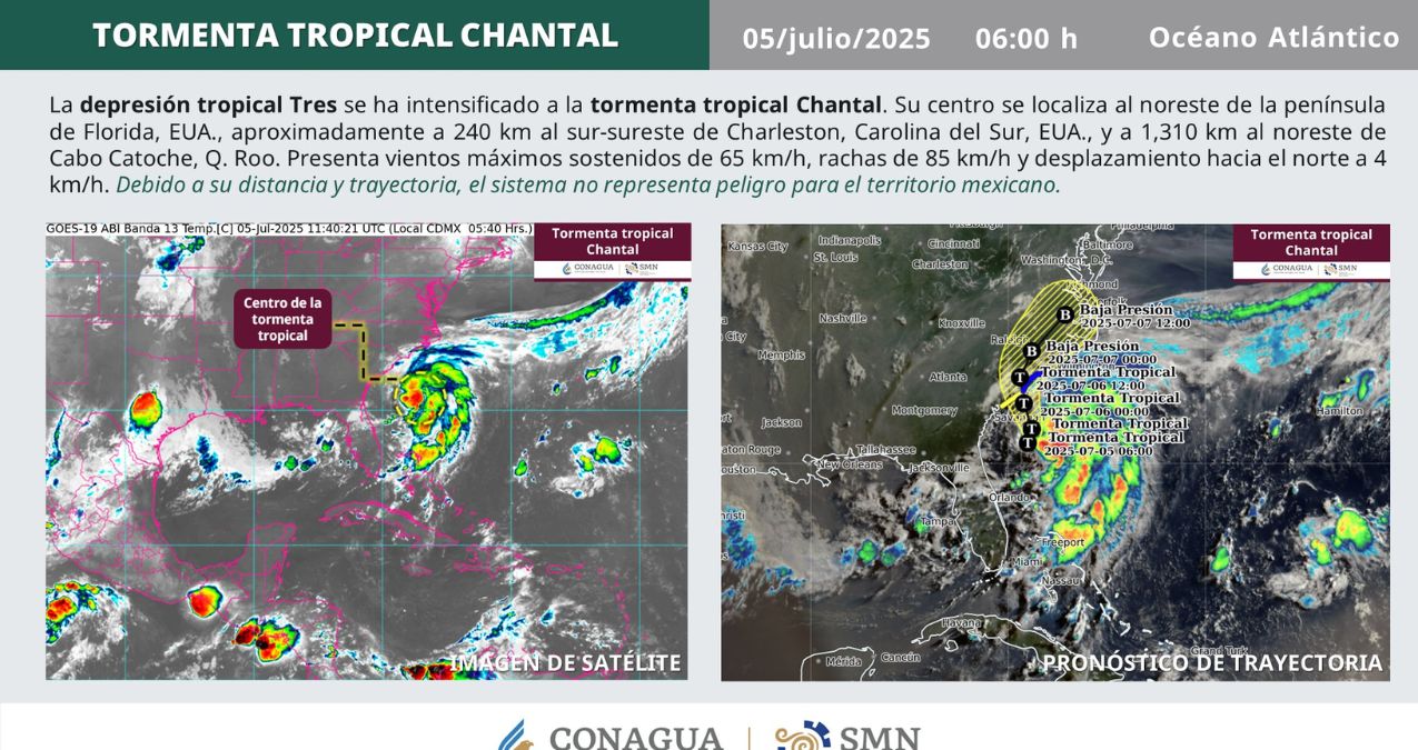 ⚠️🌀 La #DepresiónTropical Tres se ha intensificado a la #TormentaTropical #Chantal, se localiza al noreste de la península de Florida, EUA. No representa peligro para #México. 🇲🇽