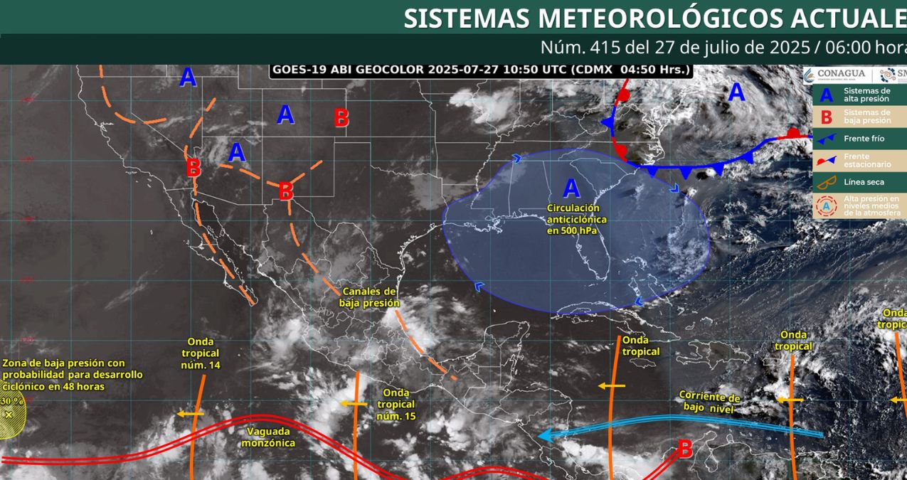 El Servicio Meteorológico Nacional (SMN), fuente oficial del Gobierno de México, emitió su pronóstico del clima para este 27 de julio, en el que advierte sobre lluvias puntuales intensas en Oaxaca y Veracruz, además de temperaturas superiores a los 45 °C en regiones del norte del país.