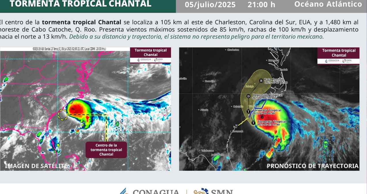 La tormenta tropical Chantal continúa desplazándose por el océano Atlántico. Según el último informe del Centro Nacional de Huracanes, mantiene vientos sostenidos que la clasifican como tormenta tropical, sin representar riesgo para las costas mexicanas por ahora.