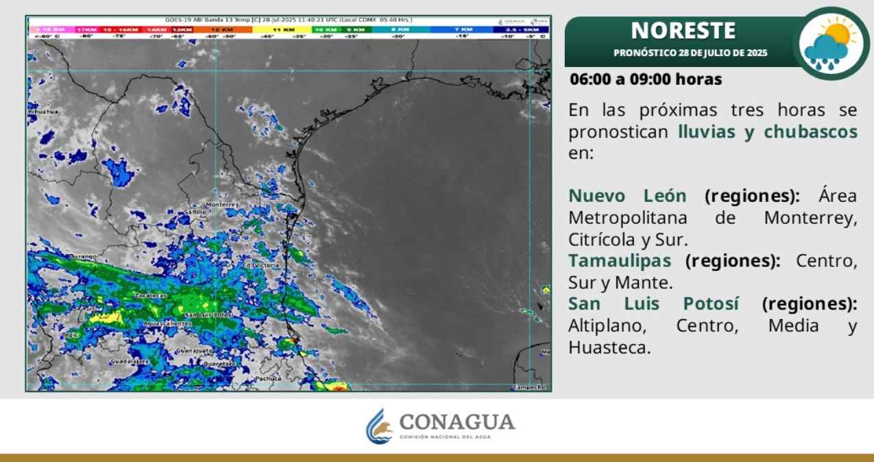 En cuanto a las lluvias, se pronostican intervalos de chubascos de 5 a 25 mm en estados del norte, centro y oriente: Baja California Sur, Coahuila, Nuevo León, Zacatecas, Aguascalientes, San Luis Potosí, Tamaulipas, Guanajuato, Querétaro, Hidalgo, Tlaxcala, Morelos y Ciudad de México.