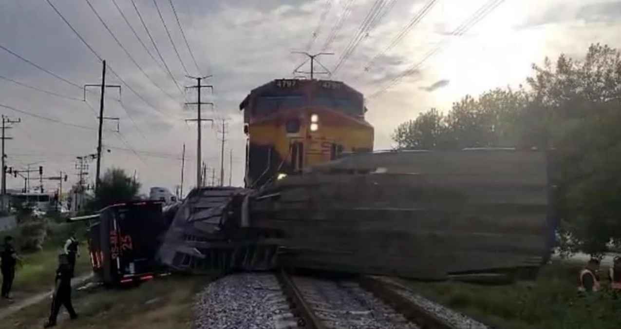 Tráiler termina volcado en Apodaca luego de ser arrastrado 40 metros por el tren