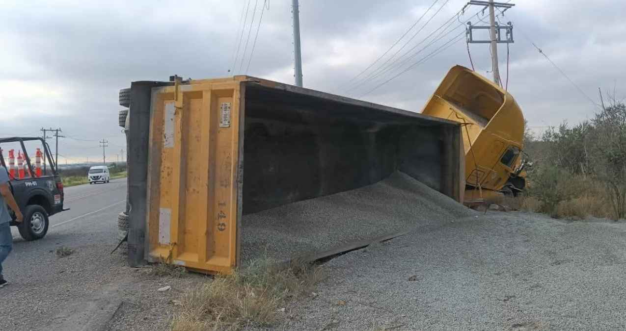 El camión, que transportaba material tipo grava, quedó volcado a un costado de la carretera, derramando parte de su carga. Las autoridades ya se encuentran coordinando labores para retirar la unidad y restablecer por completo la vialidad.