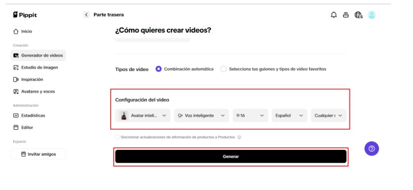 Haz clic en Más información para insertar correctamente el logotipo de la marca, el público objetivo y el precio. Después, selecciona la opción Configuración para elegir un avatar y la voz en off que quieras usar, de modo que el resultado final —de foto a vídeo— se adapte a tu estilo. También puedes editar el guion generado para ajustarlo a las necesidades de tu audiencia. Una vez que termines la configuración, solo tienes que hacer clic en Generar para obtener tu propio vídeo a partir de fotos.