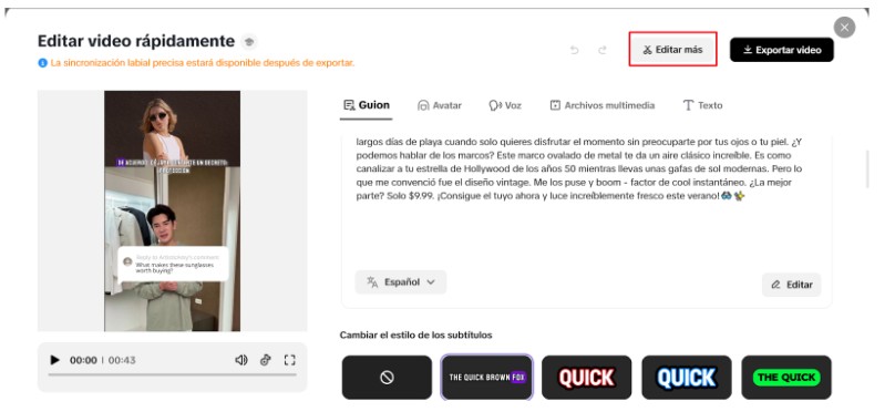 Previsualiza tu video para asegurarte de que cumple con tus estándares. Usa Edición rápida en la pestaña del video generado para ajustar guion, subtítulos, avatar o voz. Prueba distintos estilos hasta encontrar el que mejor encaje. Para modificaciones avanzadas, selecciona Editar más.