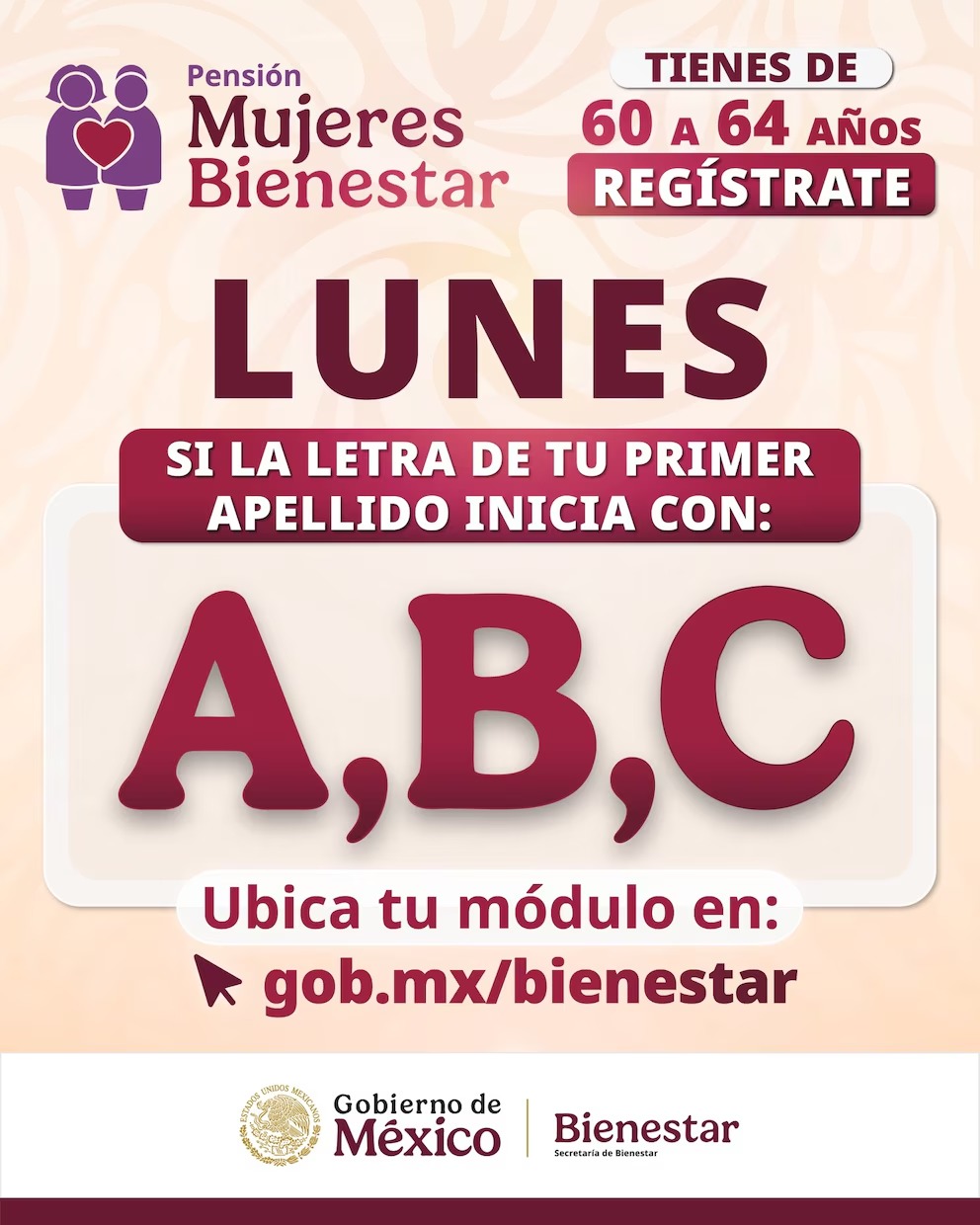 De acuerdo con el calendario de la Secretaría de Bienestar, hoy podrán registrarse las mujeres cuyo primer apellido comience con las letras A, B o C. Por su parte, el trámite se realiza en los Módulos de Bienestar y Centros LIBRE en todo el país. En un horario de 10:00 a 16:00 horas.