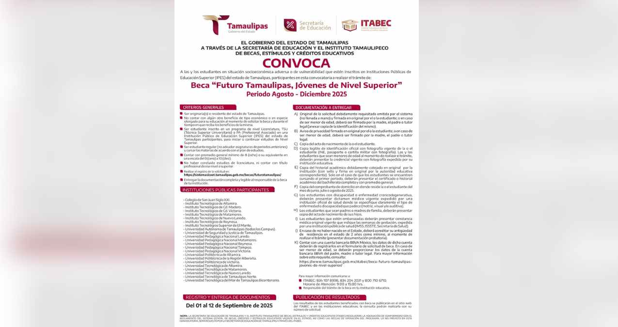 El Gobierno de Tamaulipas, a través de la Secretaría de Educación, abrió la convocatoria de la beca “Futuro Tamaulipas, Jóvenes de Nivel Superior”; para el periodo agosto-diciembre 2025.