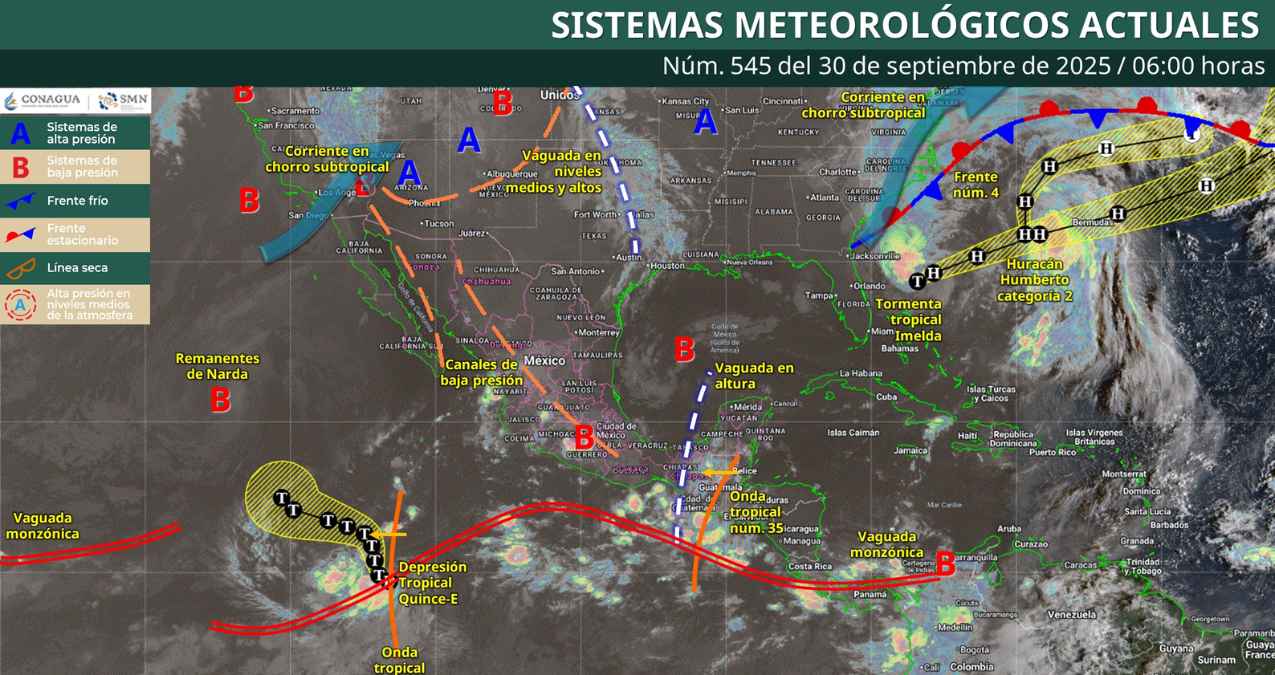 De acuerdo con el pronóstico, una baja presión en el golfo de México y una vaguada en altura sobre el sureste originarán lluvias intensas en el sur de Veracruz y Chiapas, además de precipitaciones muy fuertes en Tabasco y Oaxaca.