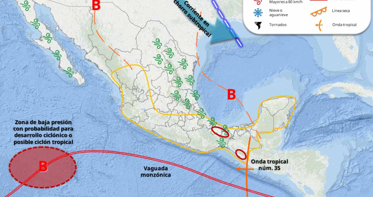 La onda tropical número 35 avanza lentamente sobre el sureste de México y se combina con una baja presión en el golfo de México y la vaguada monzónica cerca de las costas del Pacífico Sur, lo que traerá lluvias muy fuertes y tormentas eléctricas en varios estados.