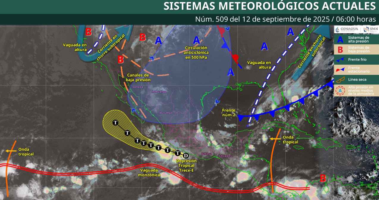 La depresión tropical Trece-E podría convertirse en tormenta tropical frente a las costas de Guerrero y Michoacán, misma que provocará lluvias. Su circulación, junto con la vaguada monzónica en el Pacífico sur, traerá lluvias muy fuertes a Guerrero, Michoacán, Colima y Jalisco, además de rachas de viento de 50 a 70 km/h y oleaje de hasta 3.5 metros.