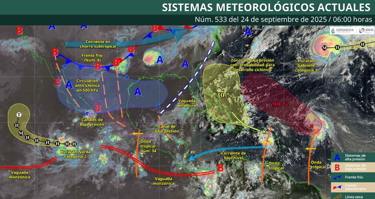 La onda tropical número 34 recorrerá el sur y sureste, dejando lluvias intensas en Oaxaca y Guerrero, y muy fuertes en Chiapas. En la península de Yucatán, se esperan lluvias muy fuertes en Campeche y Yucatán, y fuertes en Quintana Roo.