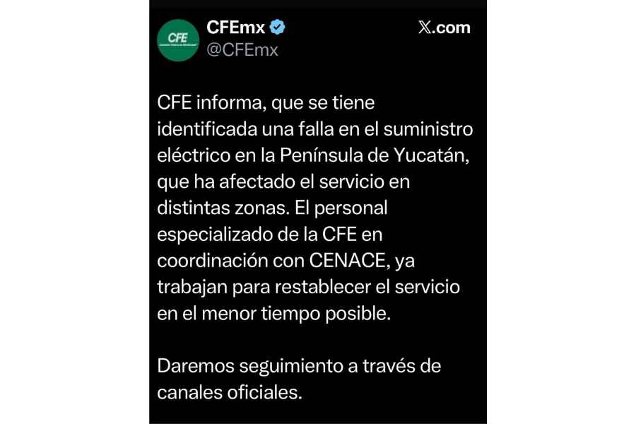 “Una falla en una línea de transmisión de electricidad en el sureste provocó un apagón en Yucatán, Campeche y Quintana Roo. Me informa CFE que las plantas de generación están bien y trabajan para recuperar el servicio en los tres estados”.