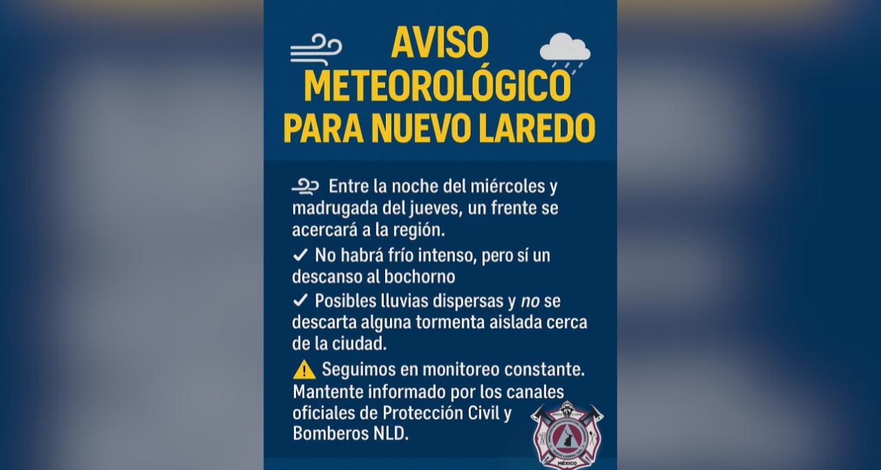 El monitoreo del sistema frontal en Nuevo Laredo será permanente y cualquier cambio en las probabilidades de lluvia o tormenta será comunicado oportunamente.