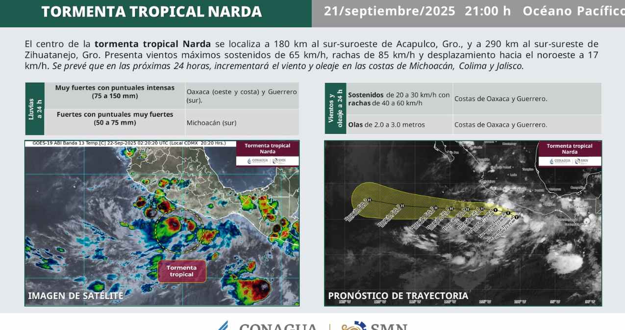 De acuerdo con los datos oficiales, el centro de Narda se localiza a 390 kilómetros al sur-sureste de Zihuatanejo, Guerrero, y a 440 kilómetros al sureste de Lázaro Cárdenas, Michoacán. La tormenta presenta vientos máximos sostenidos de 65 kilómetros por hora (km/h), con rachas de hasta 75 km/h y un desplazamiento hacia el noroeste a 17 km/h.