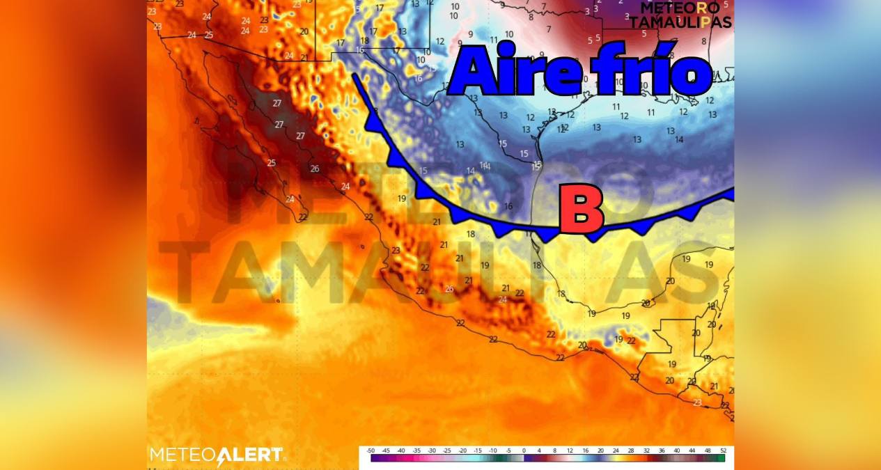 Imágenes del sitio especializado en pronósticos muestran un frente frío acercándose, mientras una masa de aire templado cede espacio al aire frío. Especialmente sobre el Golfo de México y el norte del país, afectando la región centro de Tamaulipas.