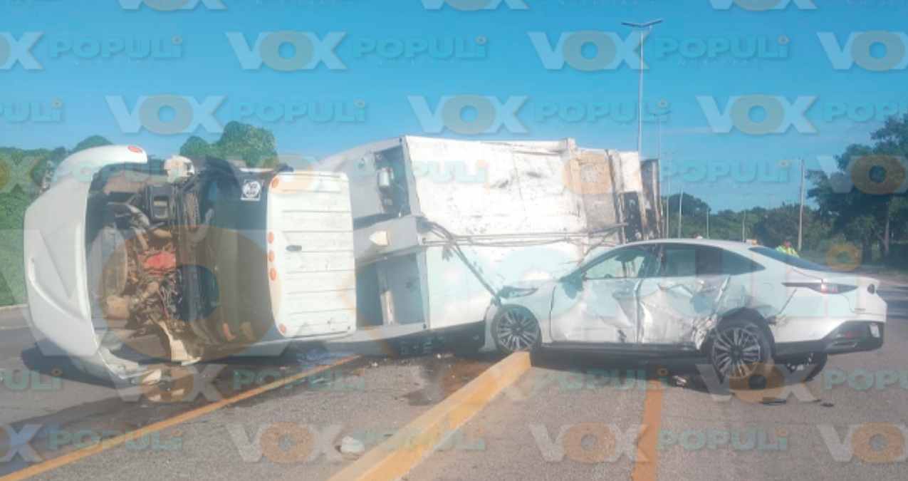 Elementos de Tránsito se movilizaron al sitio y encontraron el camión recolector volcado sobre su costado derecho, dentro del camellón central. La unidad, que iba cargada con desechos, aparentemente se dirigía al relleno sanitario del ejido Francisco Medrano.