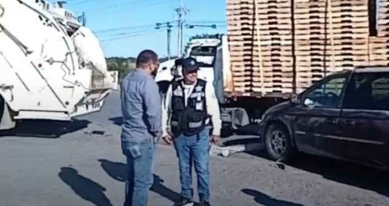 El percance, registrado durante la mañana del día miércoles, involucró cuatro unidades: un auto Nissan March, una camioneta Caravan, un camión recolector de basura y un camión que transportaba tarimas. Dicho impacto entre los vehículos provocó un estruendo que, según testigos, se escuchó a varios metros de distancia.