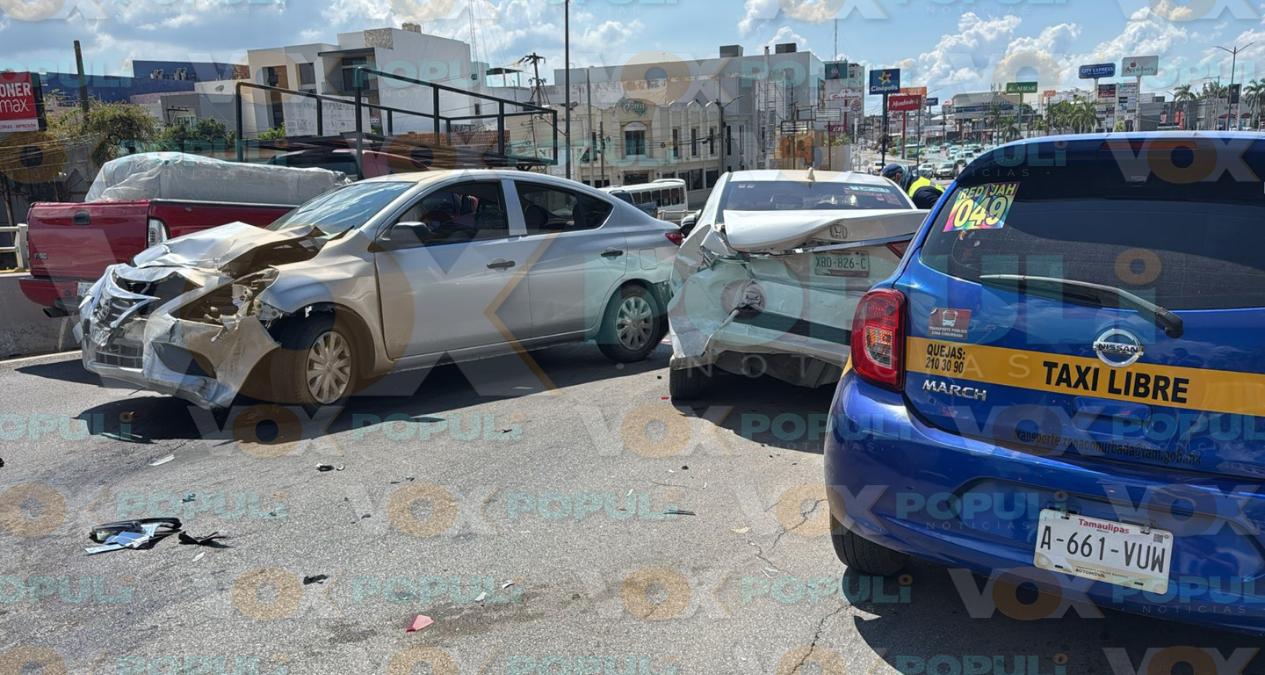 Un choque múltiple hoy en Tampico entre dos autos particulares y un taxi bloqueó el puente frente al Hotel Posada. Un Nissan Versa gris circulaba por el carril central desde el norte y chocó por alcance a un Honda City blanco con placas de Tamaulipas, causando severos daños.