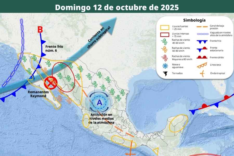 Este domingo 12 de octubre de 2025, diversas condiciones meteorológicas mantienen bajo vigilancia a gran parte del territorio nacional; prepárate ya que el clima puede ser muy lluvioso en distintas zonas. Esto, gracias a la nubosidad remanente de “Raymond”. En combinación con el frente frío número 6, la corriente en chorro subtropical, una vaguada en altura y la inestabilidad atmosférica en el noroeste del país. Además de que también favorecerán vientos fuertes.