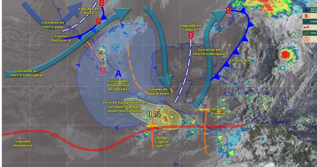 De acuerdo al Servicio Meteorológico Nacional (SMN), la onda tropical número 37 continuará su avance por el sur de las costas de Oaxaca y Guerrero, interactuando con la vaguada monzónica del Pacífico Sur y otra vaguada en altura sobre la península de Yucatán, lo que generará lluvias fuertes en el sur y sureste del país, con especial énfasis en Chiapas.