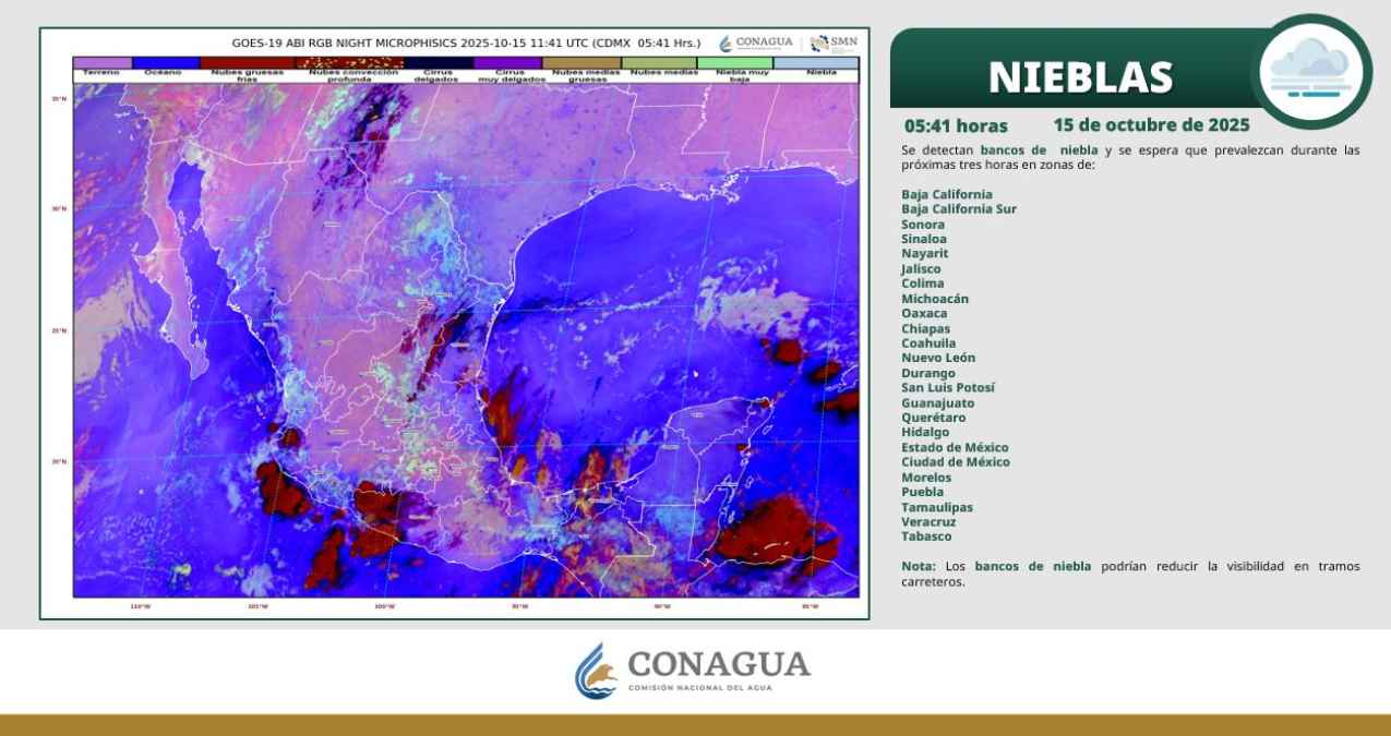 El organismo también advirtió sobre vientos de 15 a 30 km/h con rachas de 45 a 60 km/h en regiones de Baja California, Baja California Sur, Sonora, golfo de California, Chihuahua, Coahuila, Nuevo León, Tamaulipas, Zacatecas, Aguascalientes y San Luis Potosí.