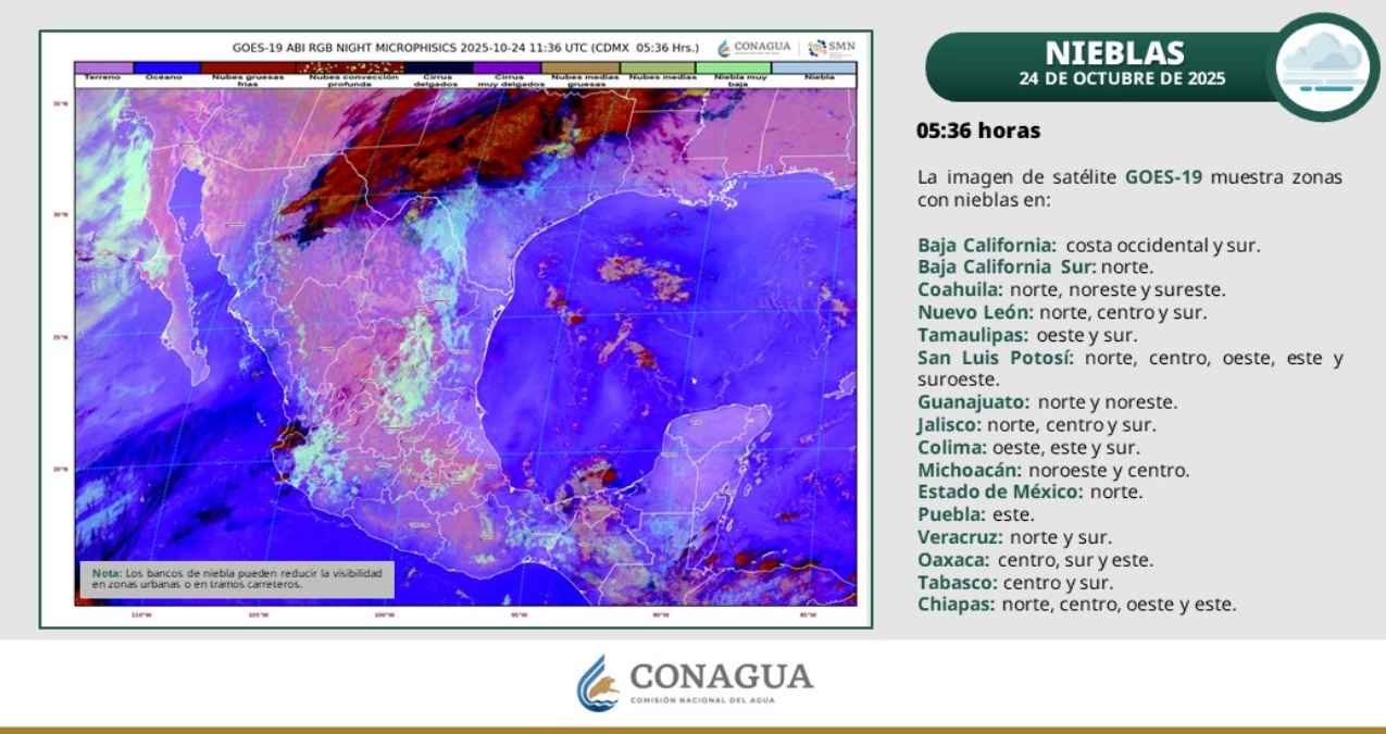 Se esperan intervalos de chubascos en Veracruz (regiones de Las Montañas y Olmeca), Nayarit (norte, centro y sur), Jalisco (oeste y sur), Colima, Tabasco (oeste y centro), Michoacán (centro, sur y costa) y Guerrero (norte, costa y sureste).