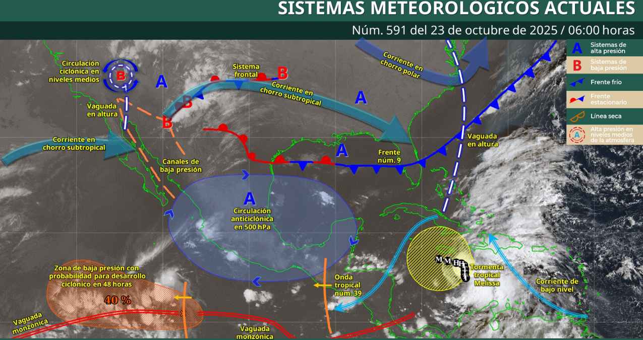 ¿El nuevo frente frío y la onda tropical 39 provocarán fuertes lluvias y vientos en México? Este jueves 23 de octubre de 2025, el Servicio Meteorológico Nacional (SMN) informó que varios sistemas atmosféricos interactúan para provocar lluvias de distintas intensidades en gran parte del país.