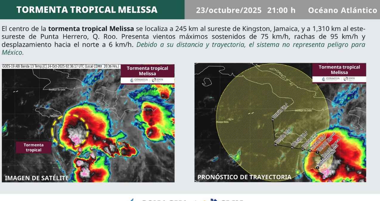 El Servicio Meteorológico Nacional (SMN) informó que la tormenta tropical Melissa se localiza en el océano Atlántico, a 245 kilómetros al sureste de Kingston, Jamaica, y a 1,310 kilómetros al este-sureste de Punta Herrero, Quintana Roo.