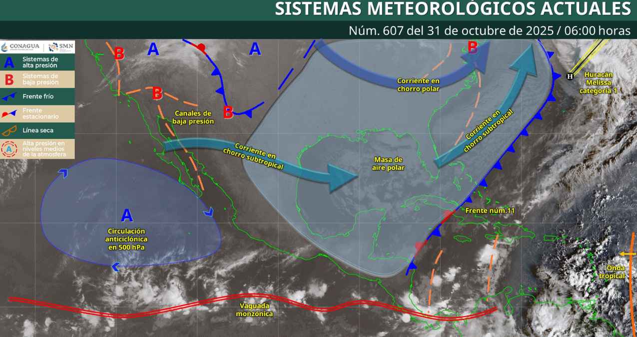 ¿El aumento en las temperaturas llegará a todos los estados de México? El aire polar que impulsó al frente frío número 11 comienza a modificar su intensidad este 31 de octubre, lo que permitirá que las temperaturas suban gradualmente en gran parte del país. Aun así, la mañana y la noche seguirán frías a muy frías en zonas del norte, centro y oriente de México, con heladas especialmente en regiones montañosas.